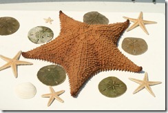 Just some of our collection. The sand dollars are still covered in little spiny hairs that will fall off, they are then greenish purple brown. They whiten in the sun or as rinsed in fresh water with bleach. I will then paint them with a 1/2 part elmers glue mixed with 1/2 part water to help harden their shell. The little starfish are soft in the water and can easily break. After rinsing them for a few hours in fresh water, they need to dry completely in the sun to harden and then painted with the same glue mix to help protect them.