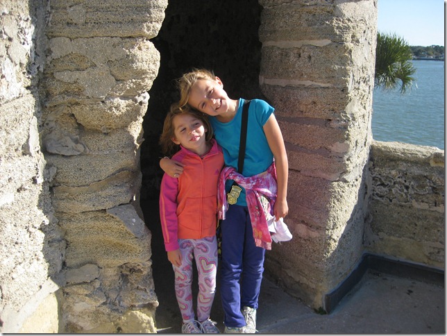 Back to St. Augustine—we are so glad we stopped, it is a beautiful city. We arrived mid afternoon, and as soon as we were settled and set dinner in the oven to bake, we all piled in the dinghy and set off for a walk around the historic town. They claim they are the oldest city in America. I had never heard this before, or I have forgotten it. But the Spanish settlled St. Augustine in the early 1500’s and as other colonies that had been settled died out, St. Augustine never did. It has existed since it was settled. They have maintained their historic waterfront and as you walk around, you feel as if you are in a European country. There are narrow streets and alleys, historic buildings with spanish flair, it is just beautiful. And since it was the holiday season, as the sunset the streets lit up with white Christmas lights everywhere. While out and exploring the town we passed by the Governors Mansion where the National Park Service performs a re-enactment of the Spanish Changing of the Guard, as it was done during wartime with the nearby French colony. We had fun watching the guards in their uniforms discharge their weapons and change places, listening to them take their orders in Spanish.